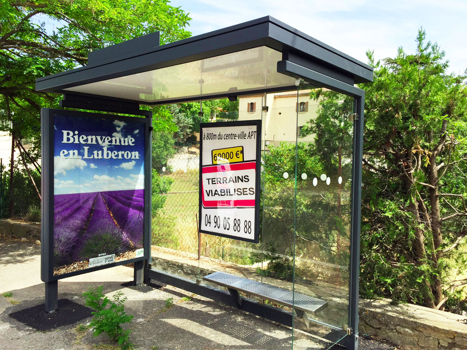 Affichage par pinces affiches inox sur cadre aluminium et diffusant.
